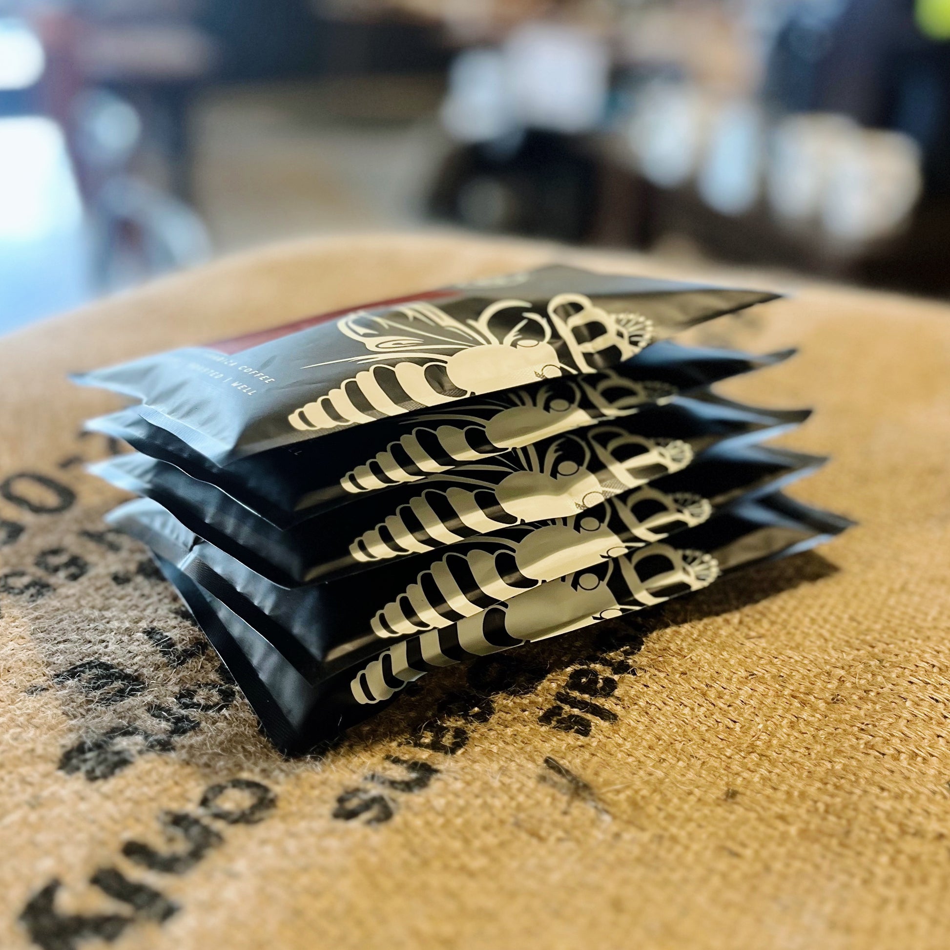 Each Starter Sample Kit includes FIVE 2.25 ounce portion packs of coffee. Each pouch is enough coffee to brew a 48 oz pot of coffee or a couple of brews using your favorite single serve brew method - pour-over, french press, etc. This will allow you to experience Queen Bee Coffee in several different brew methods!